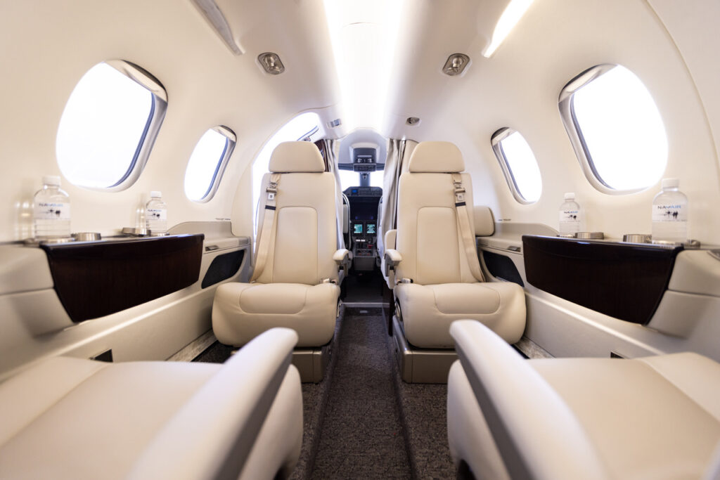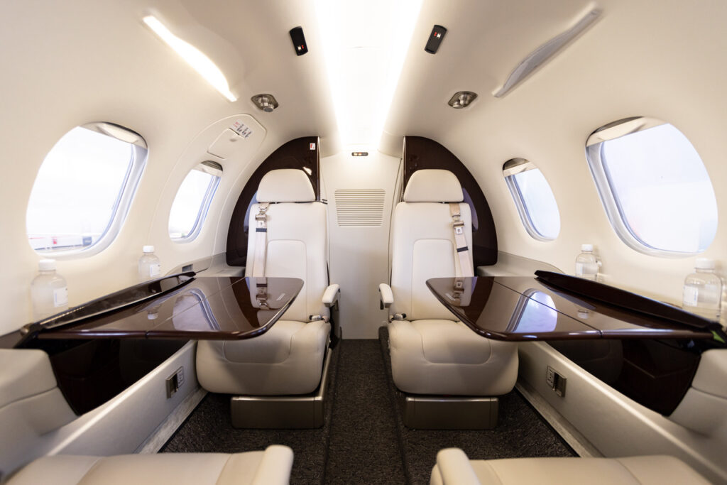 The interior of the Phenom 100 will surprise you, with seating for up to five passengers and providing efficient, luxurious air travel, it is a perfect choice for domestic flights and is popular with both business and leisure travellers. Its small size and economical running costs make it extremely convenient for short flights, yet the Phenom retains the ability to stretch its legs when required; boasting a range of over 2000km. This aircraft requires a sealed runway, but can land at most regional airports within Australia. Luxuriously appointed in cream leather throughout the cabin interior; four passengers can enjoy a conversation, indulge in a few drinks, or talk business in the club-style seating layout. To cater for an extra fifth passenger, the co-pilot seat can be used, offering the rare opportunity to experience a flight from the cockpit of a jet. The Phenom 100 is fitted with fold out tables, cup holders and has a fully enclosed toilet at the rear of the aircraft. It may be classified as a very light private jet, but the Phenom 100 is competitive with larger private jets in performance and space.